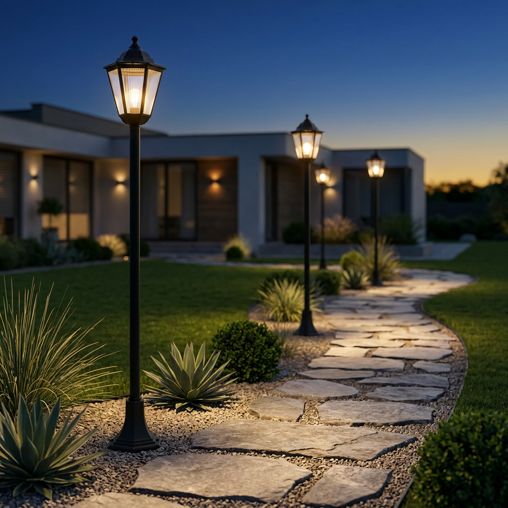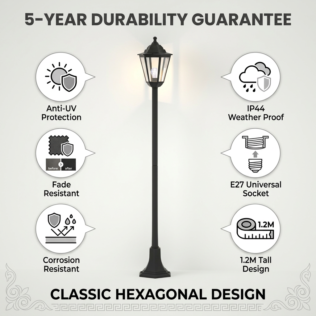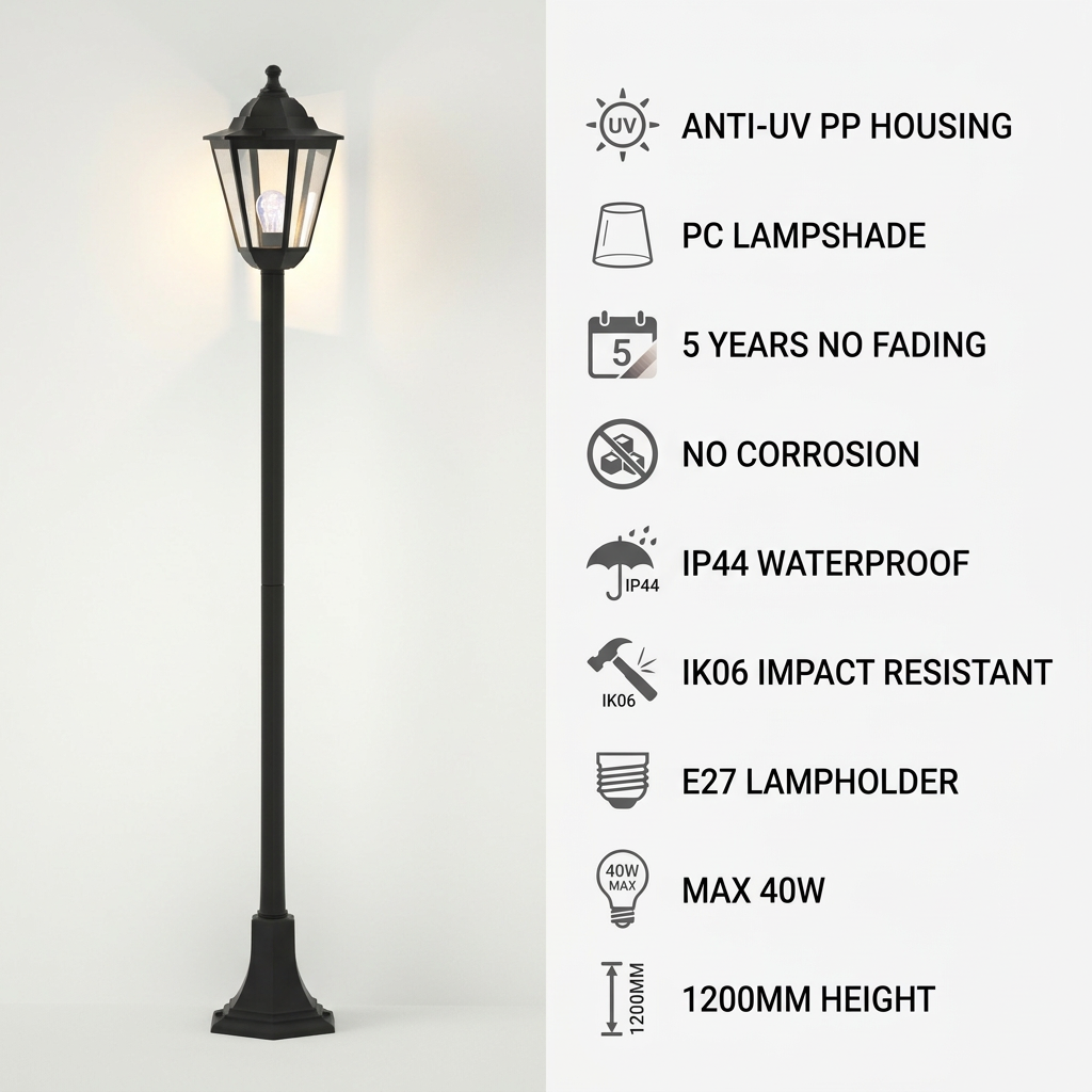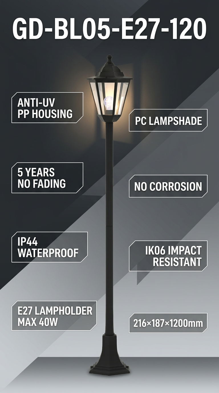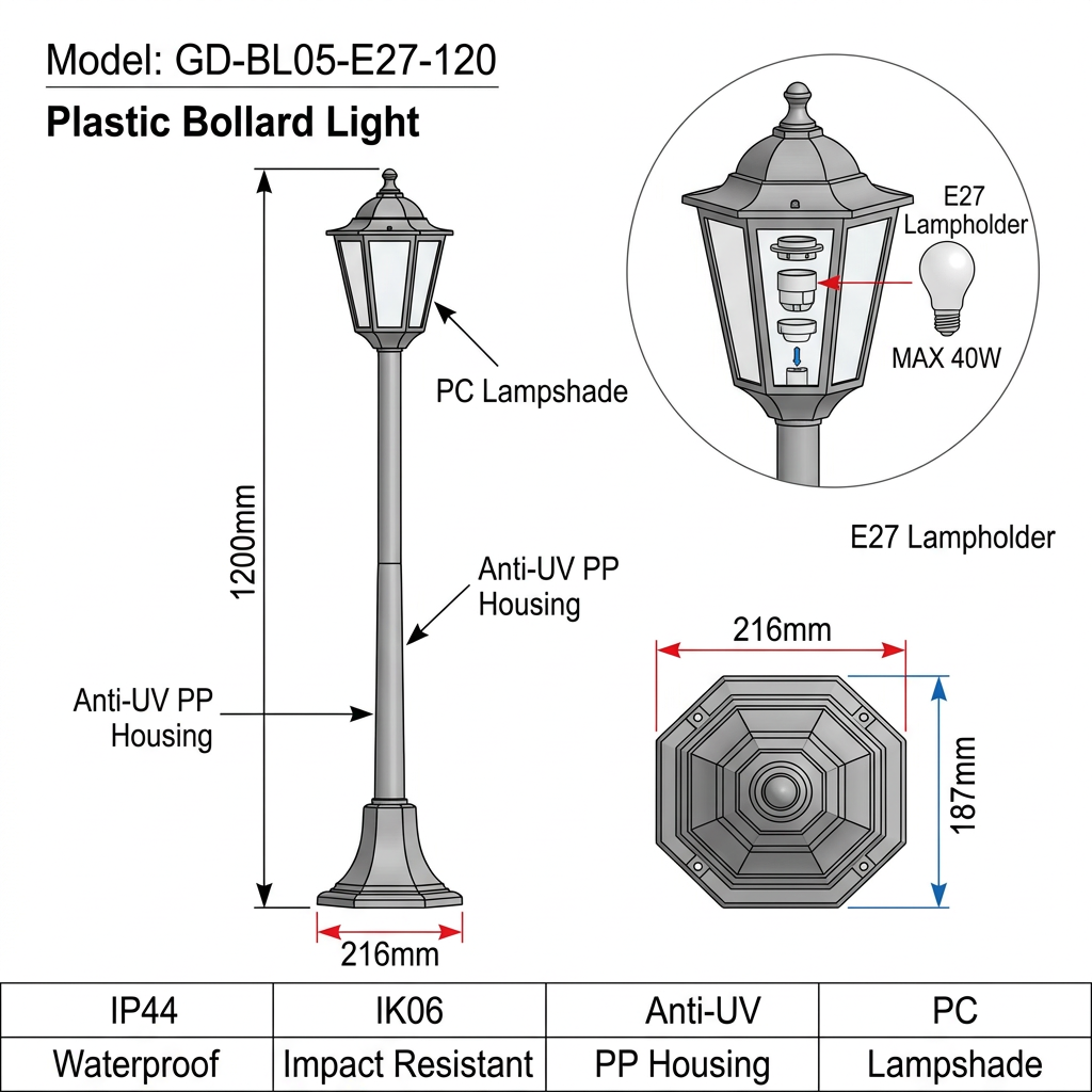 IP44 (resistente a respingos) + IK06 (impacto de 1J). A parte superior inclinada evita o acúmulo de água. Ideal para jardins, caminhos e casas de campo.