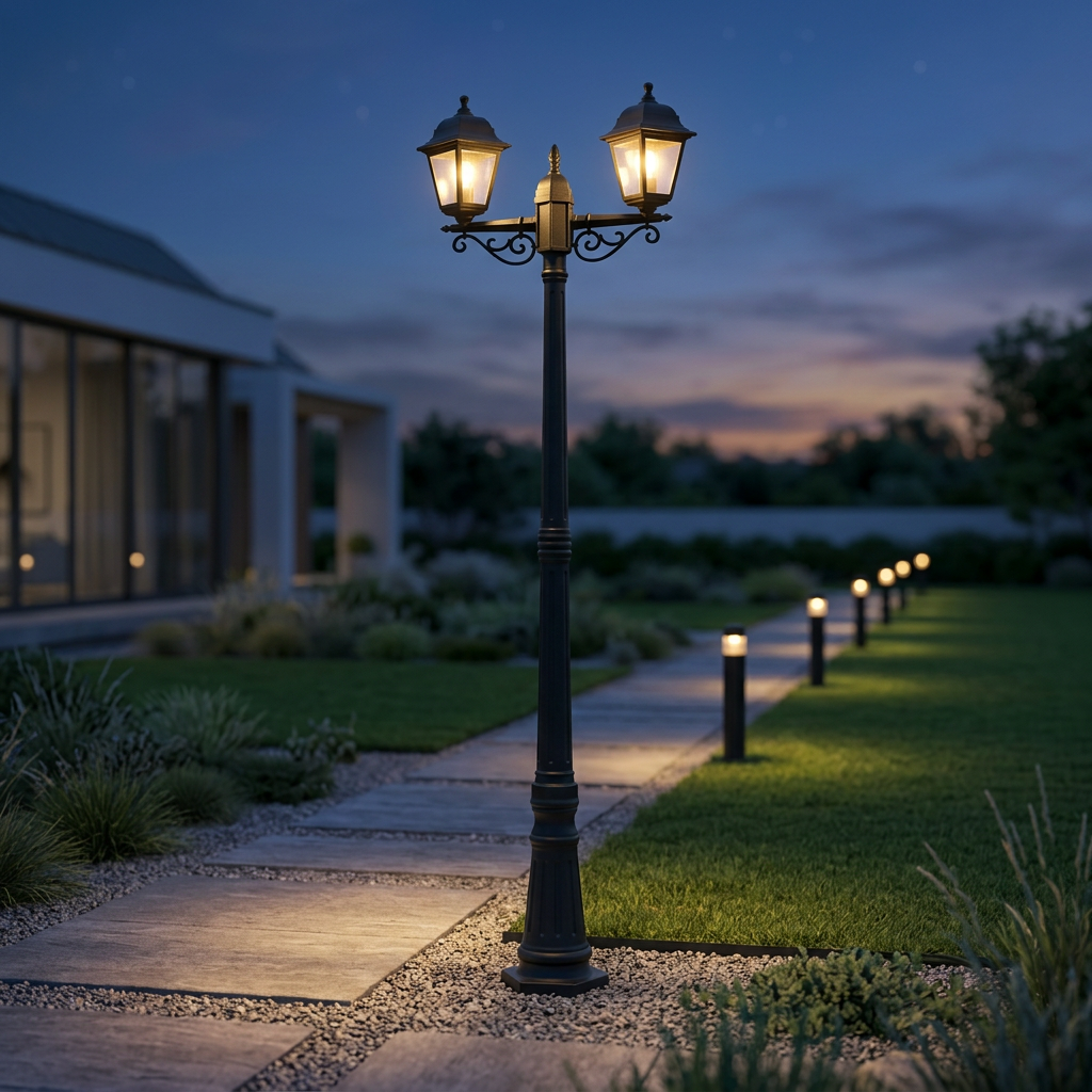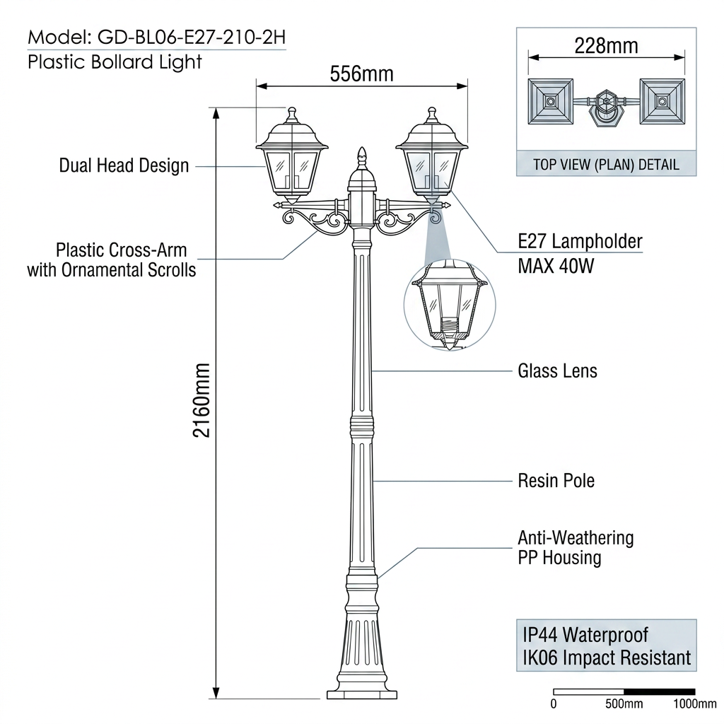 IP44 (resistente a respingos) + IK06 (impacto de 1J). A parte superior inclinada evita o acúmulo de água. Ideal para jardins, quintais e casas de campo.