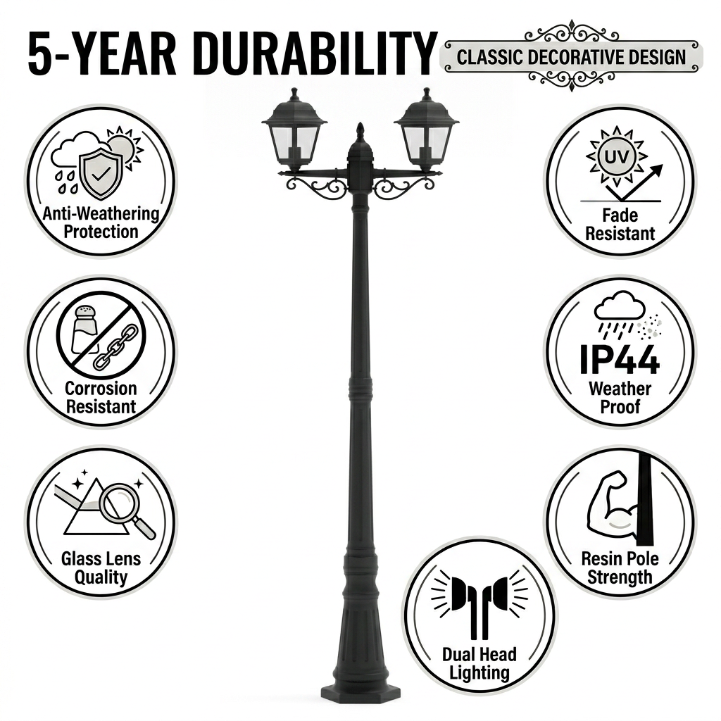 Carcaça em PP resistente às intempéries + haste em resina + lente de vidro (teste QUV de 3000 horas), resistente a raios UV/temperatura/umidade, sem amarelamento/rachaduras.