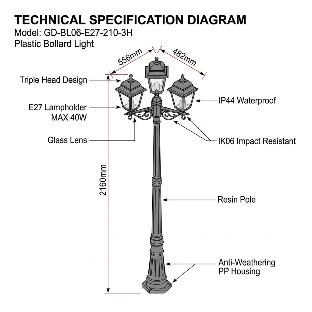 IP44 (resistente a respingos) + IK06 (impacto de 1J). A parte superior inclinada evita o acúmulo de água. Ideal para jardins, quintais e casas de campo.