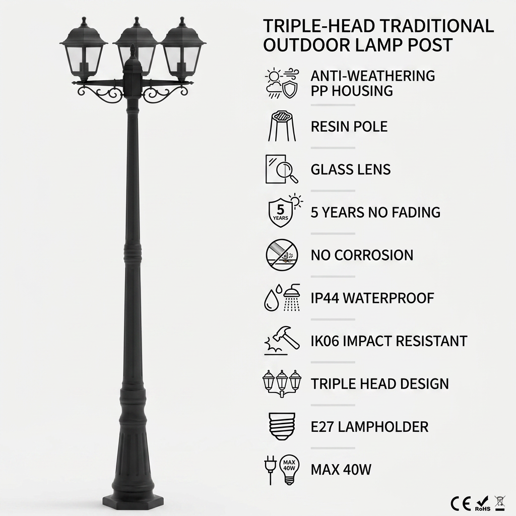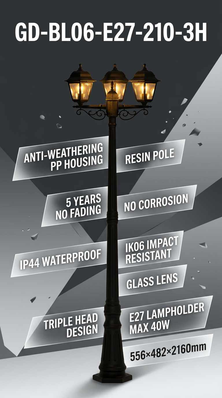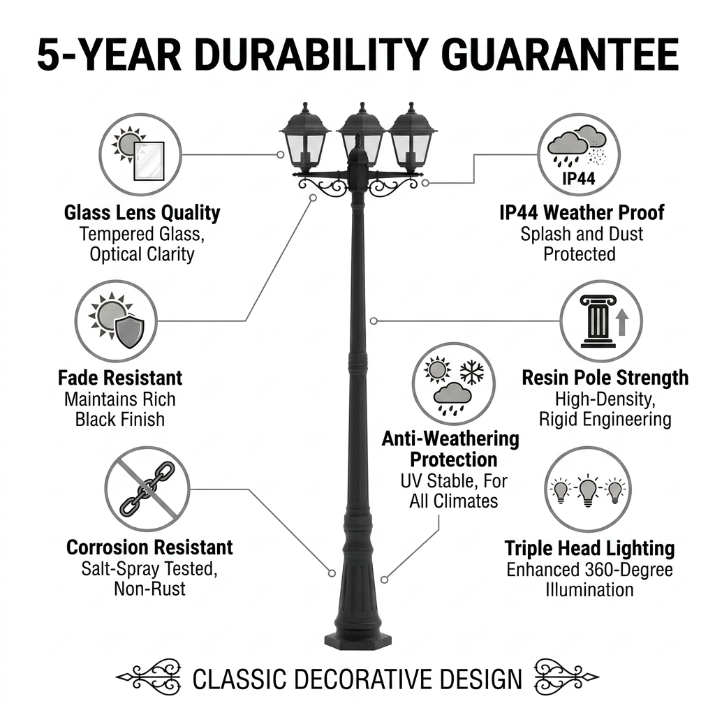 Carcaça em PP resistente às intempéries + haste em resina + lente de vidro (teste QUV de 3000 horas), resistente a raios UV/temperatura/umidade, sem amarelamento/rachaduras.