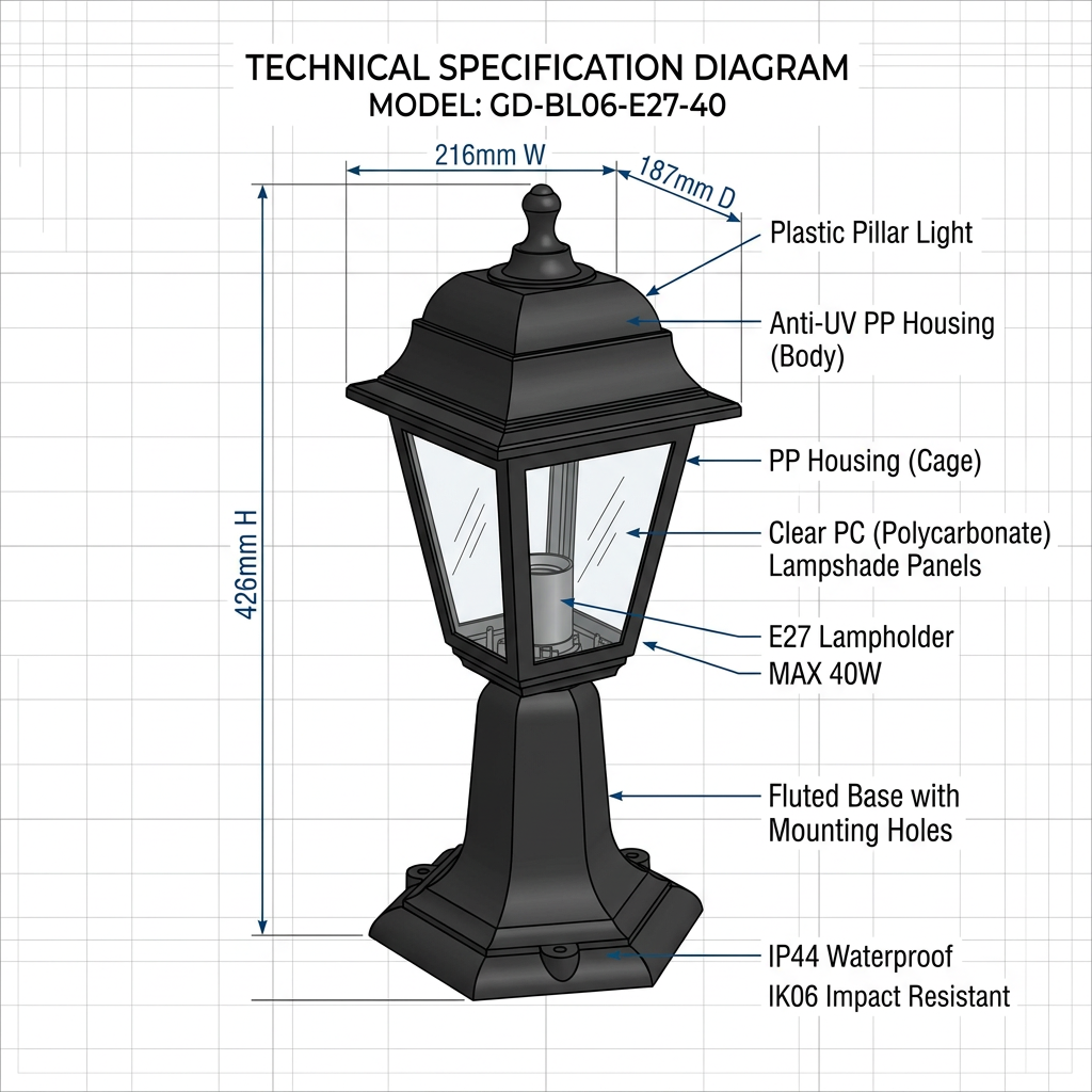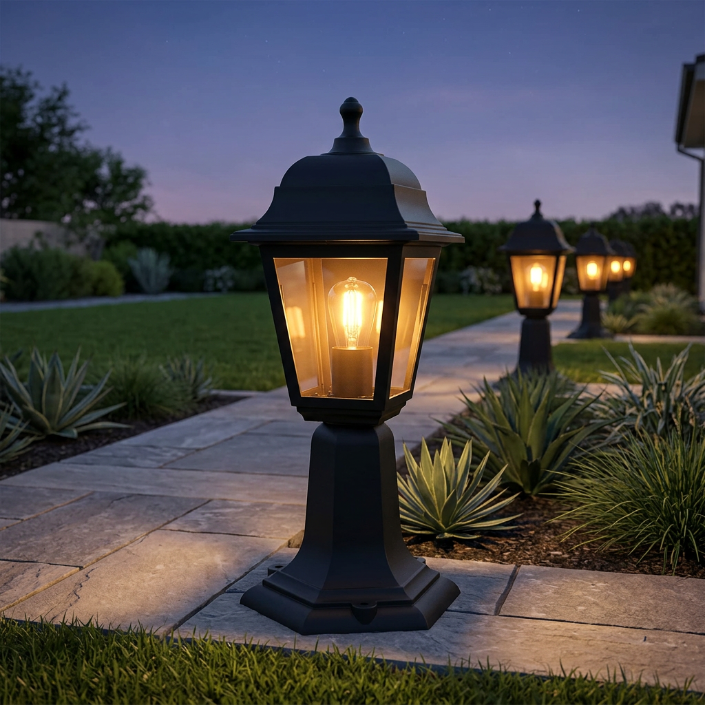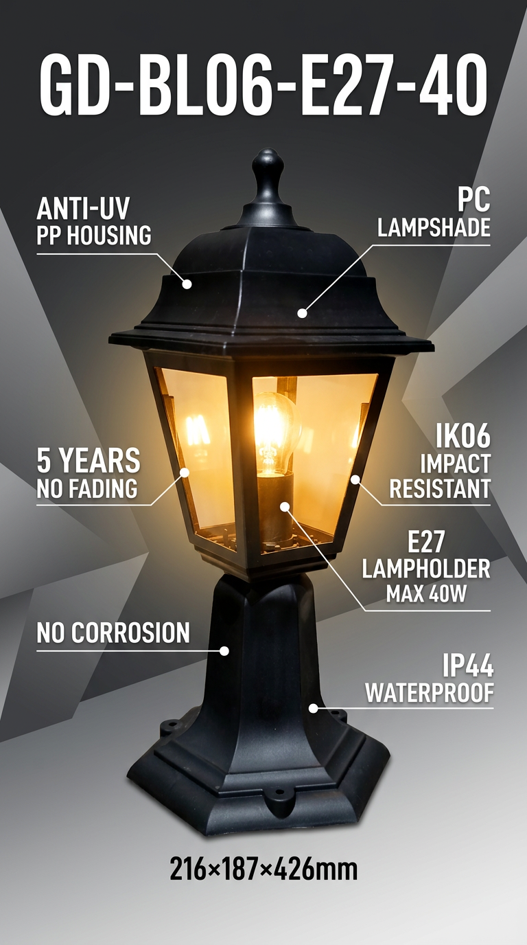 为您的庭院提供高透玻璃柱灯照明这款405mm高的柱灯采用抗紫外线P P外壳与高透玻璃透镜,专为户外长期使用设计。195×165mm的稳重底座提供良好稳定性,405mm的高度使光线处于舒适的视线高度,提供360°环绕照明,清晰照亮步道边缘,提升夜间庭院的安全感与氛围感。