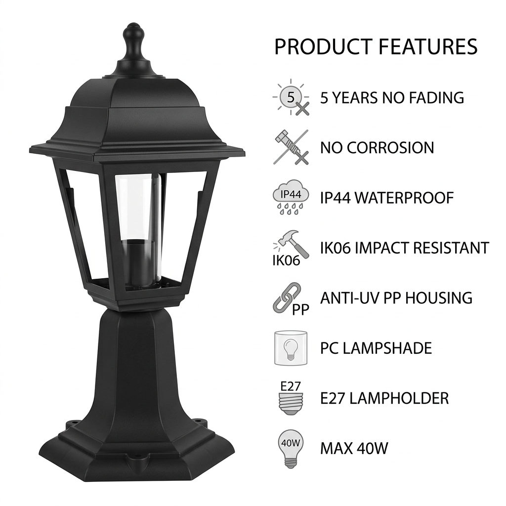 Luminária de poste externa para jardim, soquete E27, material PP, 405 mm, à prova d'água IP44, lente de vidro, resistente a raios UV, impacto IK06, iluminação paisagística ecológica.