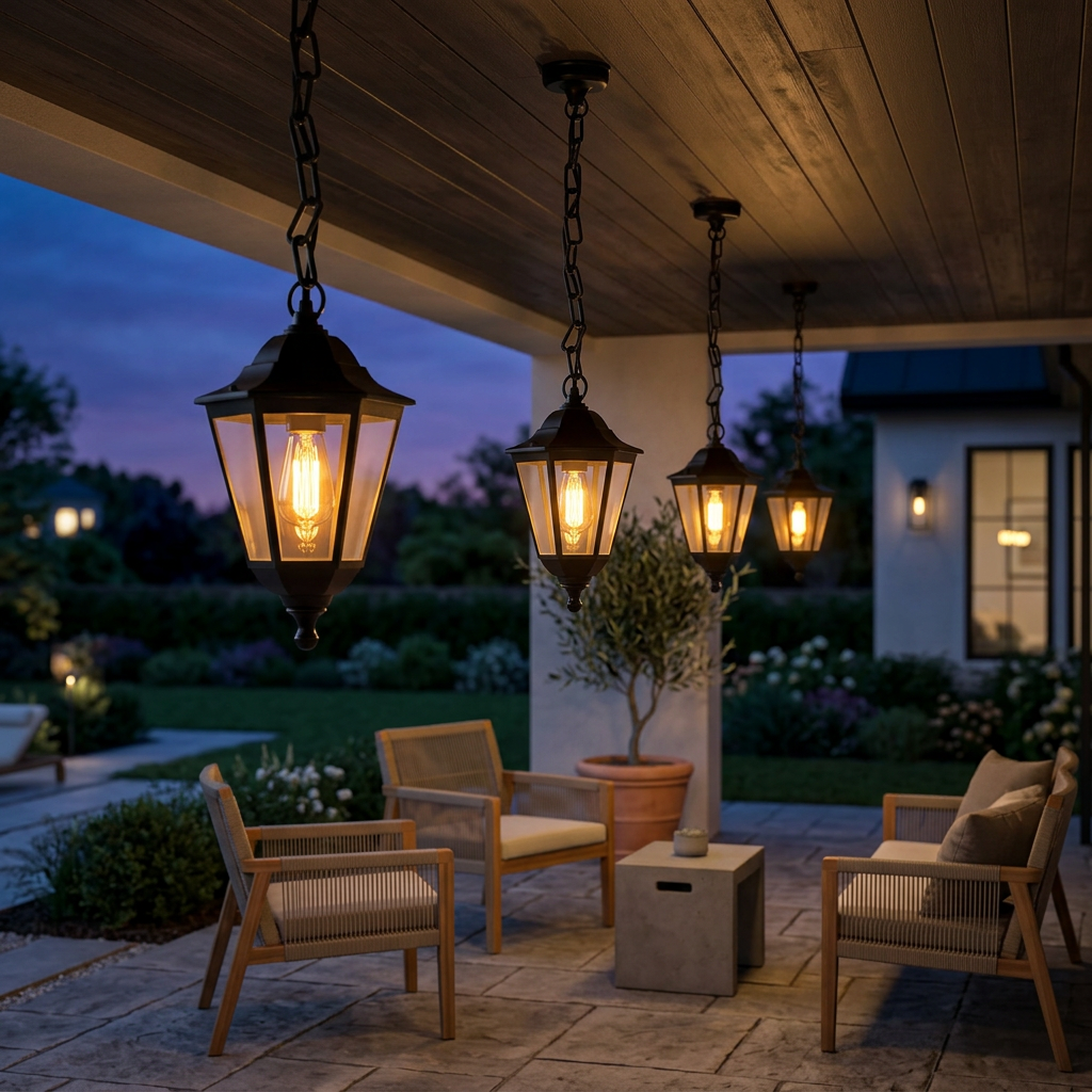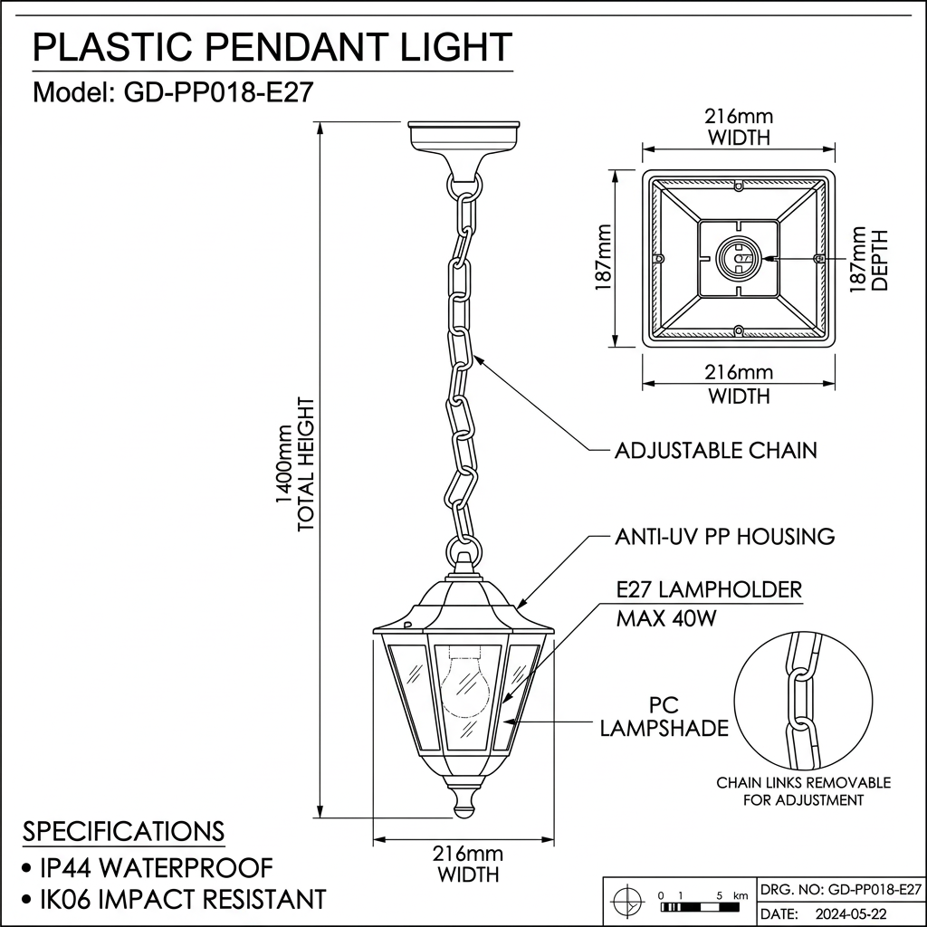 Comprimento total de 1400 mm (incluindo corrente/haste), corpo da luminária de 216×187 mm. Proporciona iluminação direcionada para baixo, cobre uma área de 8 a 12 m², criando um ambiente aconchegante.