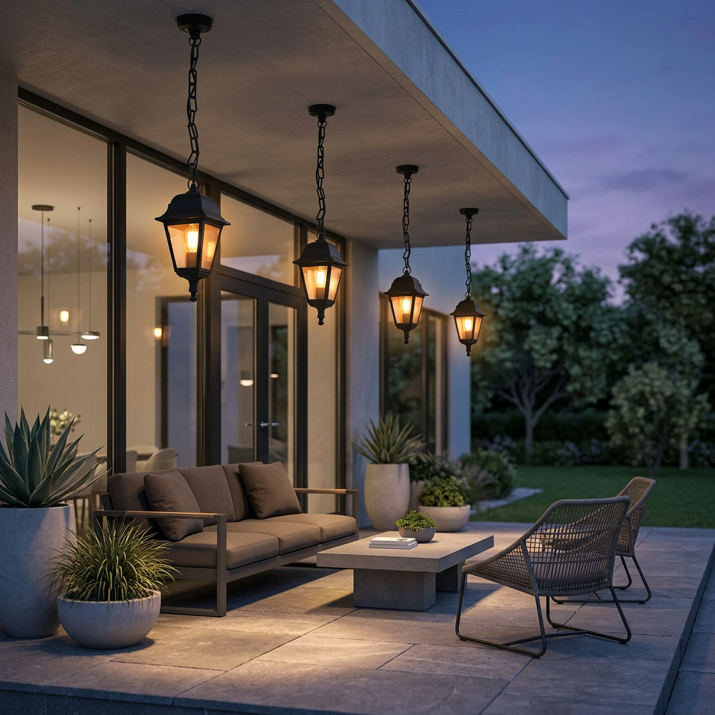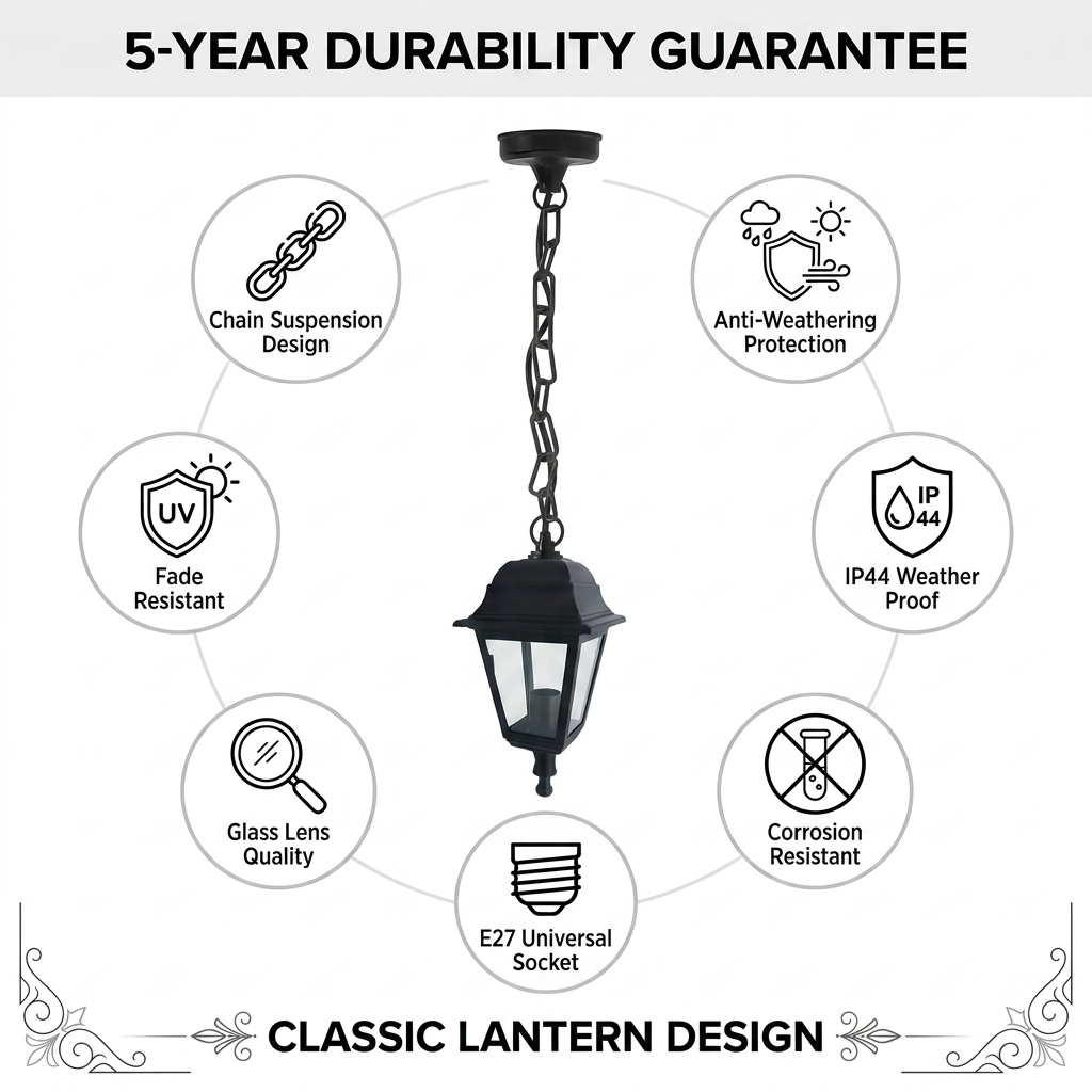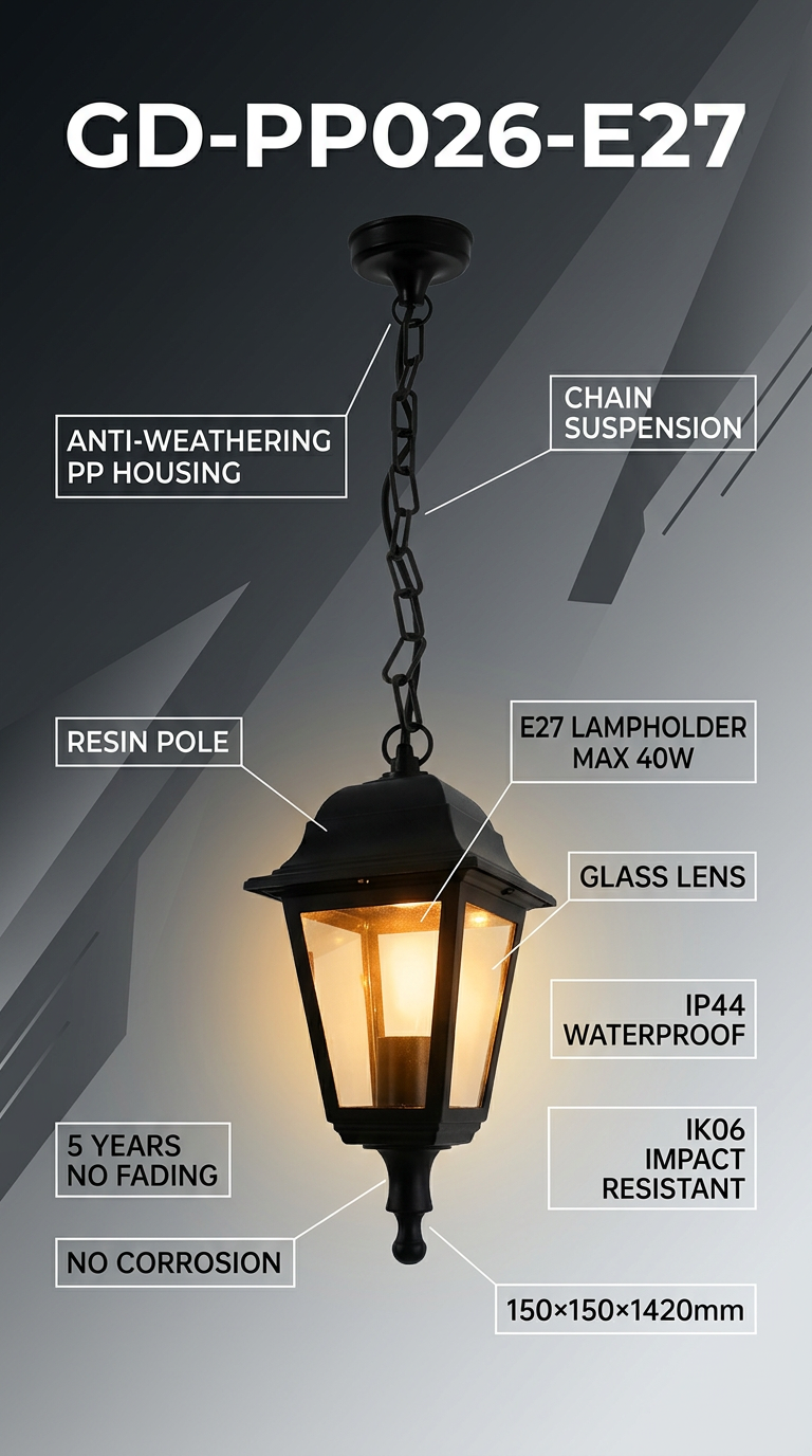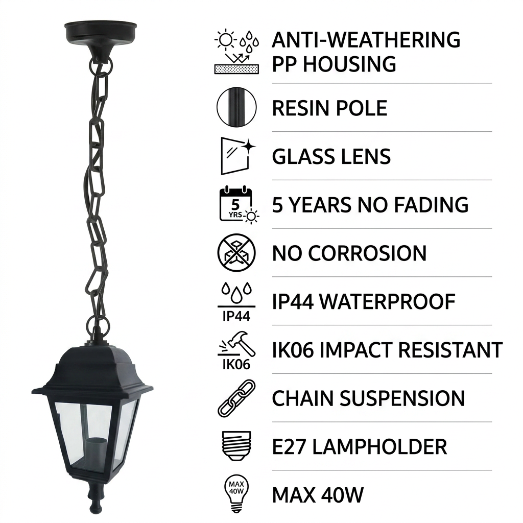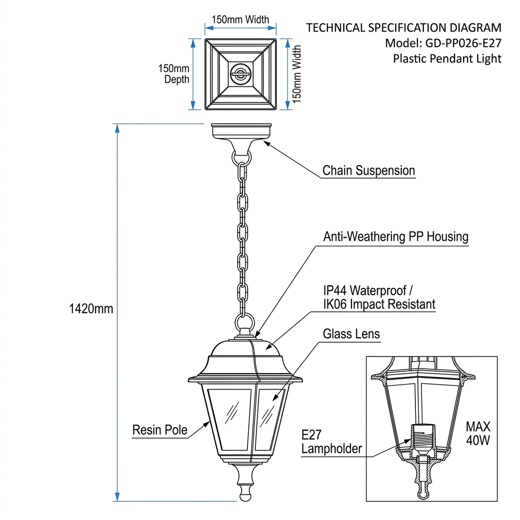 Comprimento total de 1420 mm (incluindo corrente/haste), corpo da luminária quadrado de 150×150 mm. Proporciona iluminação direcionada para baixo, cobre uma área de 8 a 12 m², criando um ambiente aconchegante.
